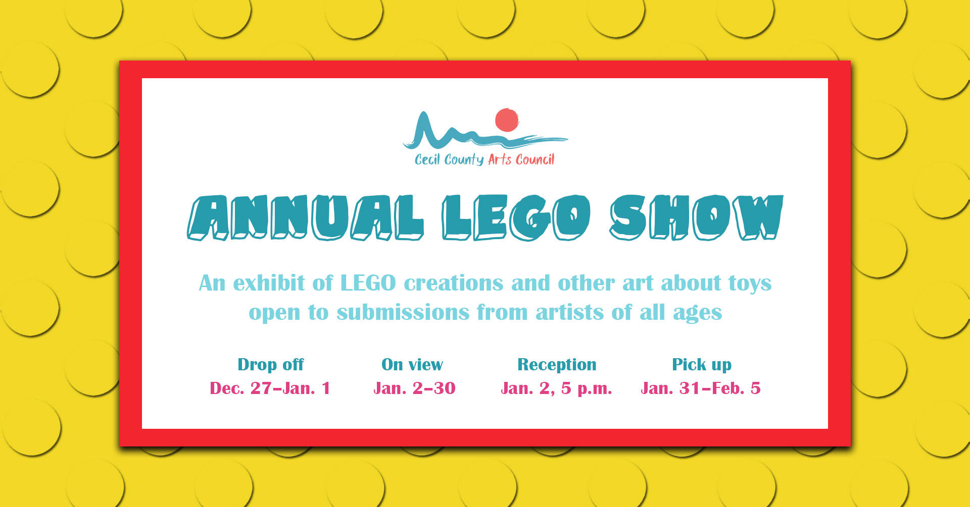 Calling all artists! The Cecil County Arts Council’s January exhibit is our annual Lego Show, featuring Lego creations and art about toys. We will be accepting submissions of Lego creations and art in all media from Dec. 27–Jan. 1. Artists and Lego enthusiasts of all ages are welcome to enter artwork in this show. To submit your work, bring it to the Arts Council at 135 E. Main St., Elkton, MD. We ask you to fill out a registration form, which is available at the gallery and can also be downloaded here: Annual Lego Show registration form (pdf)