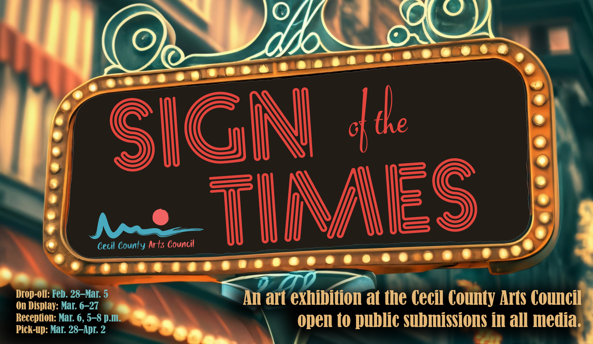 Calling all artists! The Cecil County Arts Council’s March exhibit is “Sign of the Times.” We will be accepting public submissions in all media from February 28–March 5. All artists are welcome to enter artwork in this show. To submit your artwork, bring it to the Arts Council at 135 E. Main St., Elkton, MD. We ask you to fill out a registration form, which is available at the gallery and can also be downloaded here: Sign of the Times registration form.