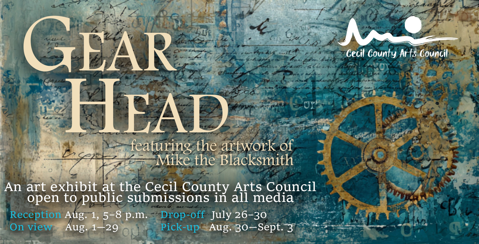 Calling all artists! The Cecil County Arts Council will be accepting submissions in all media for our August exhibit, “Gearhead,” from July 26–July 31. All artists are welcome to enter artwork in this show. To submit your artwork, bring it to the Arts Council at 135 E. Main St., Elkton, MD. We ask you to fill out a registration form, which is available at the gallery and can also be downloaded here: Gearhead registration form.