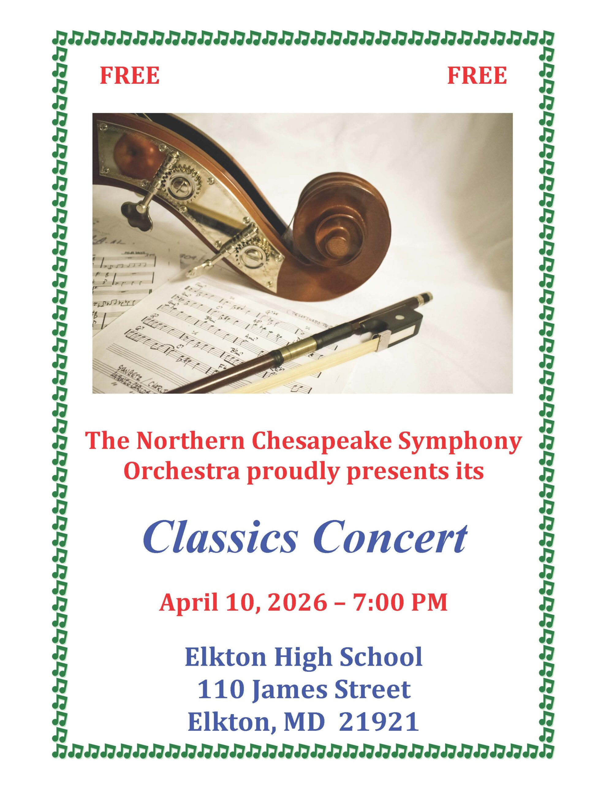 Join the Northern Chesapeake Symphony Orchestra for their Classics Concert on April 10 at 7 p.m. The concert will take place at the Elkton High School auditorium.