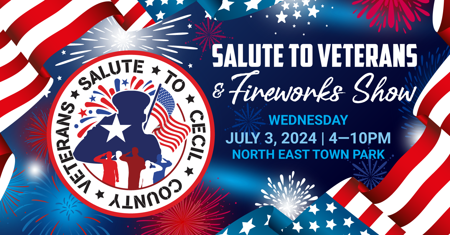 Saluting our Nation’s Veterans in Cecil County on Wednesday, July 3, 2024. Starting at 4pm there will be a Ceremony, followed by Family-Fun, Food, Music, Displays, and of course – FIREWORKS!